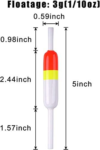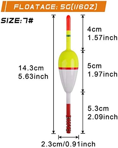 SUFFICIENT QUANTITY: The package of FUSIGO contains 2 types of fishing floats and bobbers, which measures approx.2.44 X0.59 X 5 inch and 1.97 X0.91 x5.63 inch (the length of the floating ellipsoid x the width of the floating ellipsoid x the total floating length). Adequate quantity and suitable size to meet your fishing needs. Available in 20pcs or 10pcs.