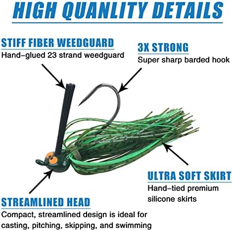 【ATTRACTIVE SKIRT】Bass Fishing jigs with premium silicone skirt imparts great action, which produce a lifelike look and action. color-matched head paint schemes elicit close-combat strikes,the bright colors skirts could attract the fish and avoid hanging on the bottom in water